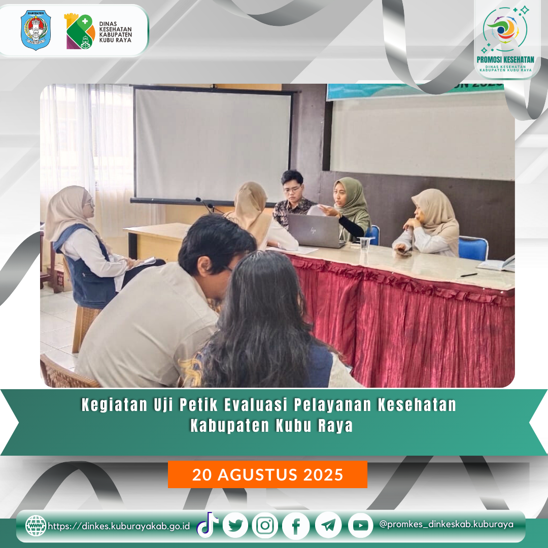 Dinas Kesehatan Kabupaten Kubu Raya melaksanakan Uji Petik Evaluasi Pelayanan Kesehatan di beberapa fasilitas kesehatan, yaitu Rumah Sakit, Puskesmas Sungai Raya Dalam, dan Puskesmas Sungai Kakap.