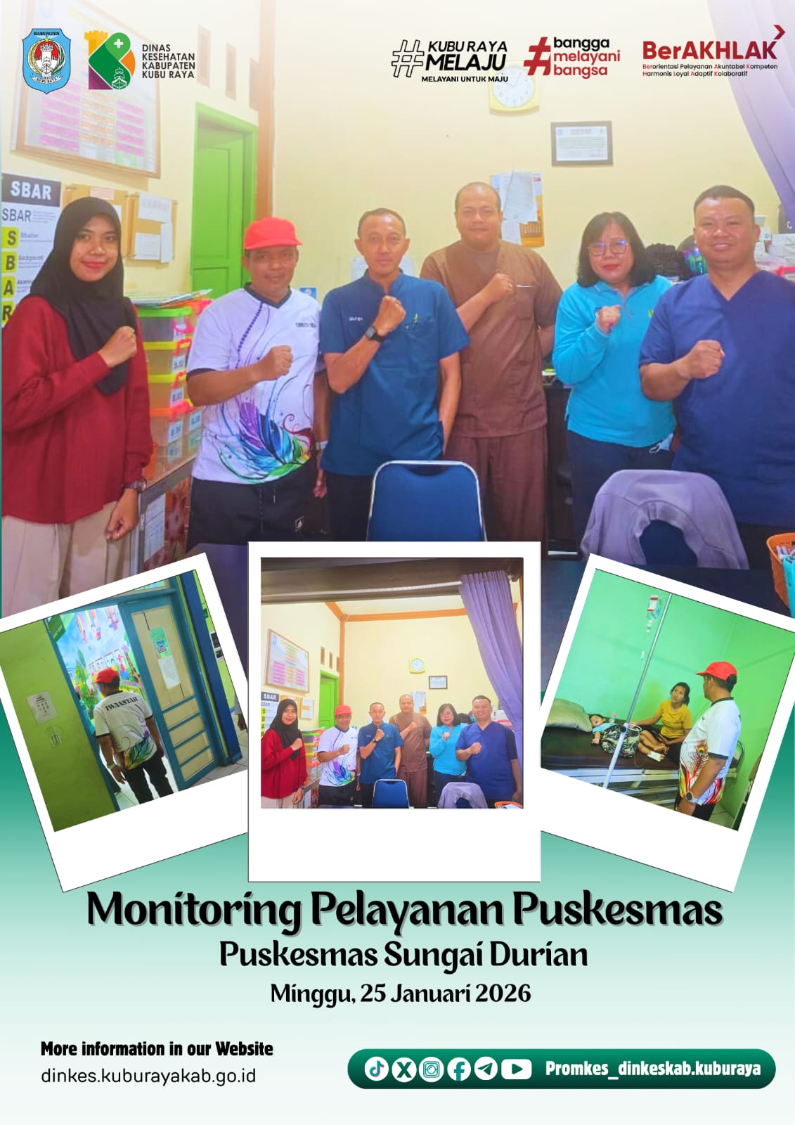 Kepala Dinas Kesehatan Kabupaten Kubu Raya, H. Wan Iwansyah, S.Pd., S.KM., M.AP, melaksanakan monitoring pelayanan kesehatan di Puskesmas Sungai Durian pada Minggu, 25 Januari 2026.