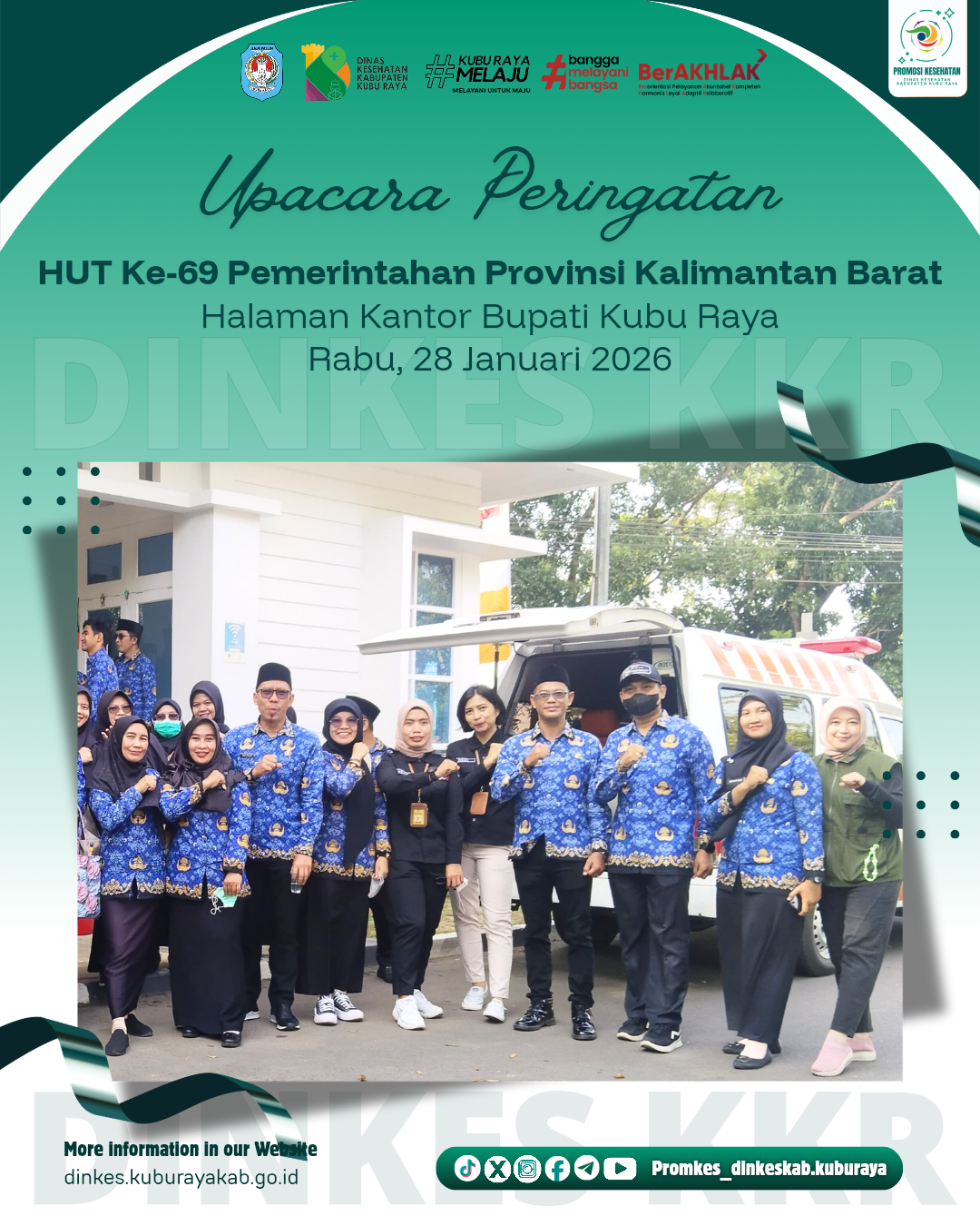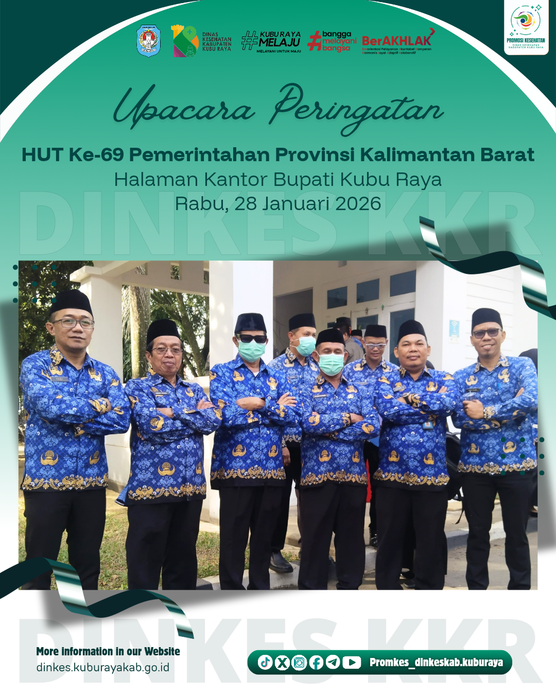 Dinas Kesehatan Kabupaten Kubu Raya turut mengikuti Upacara Peringatan Hari Ulang Tahun (HUT) ke-69 Pemerintah Provinsi Kalimantan Barat yang dilaksanakan di halaman Kantor Bupati Kubu Raya, Rabu (28/01/2026).