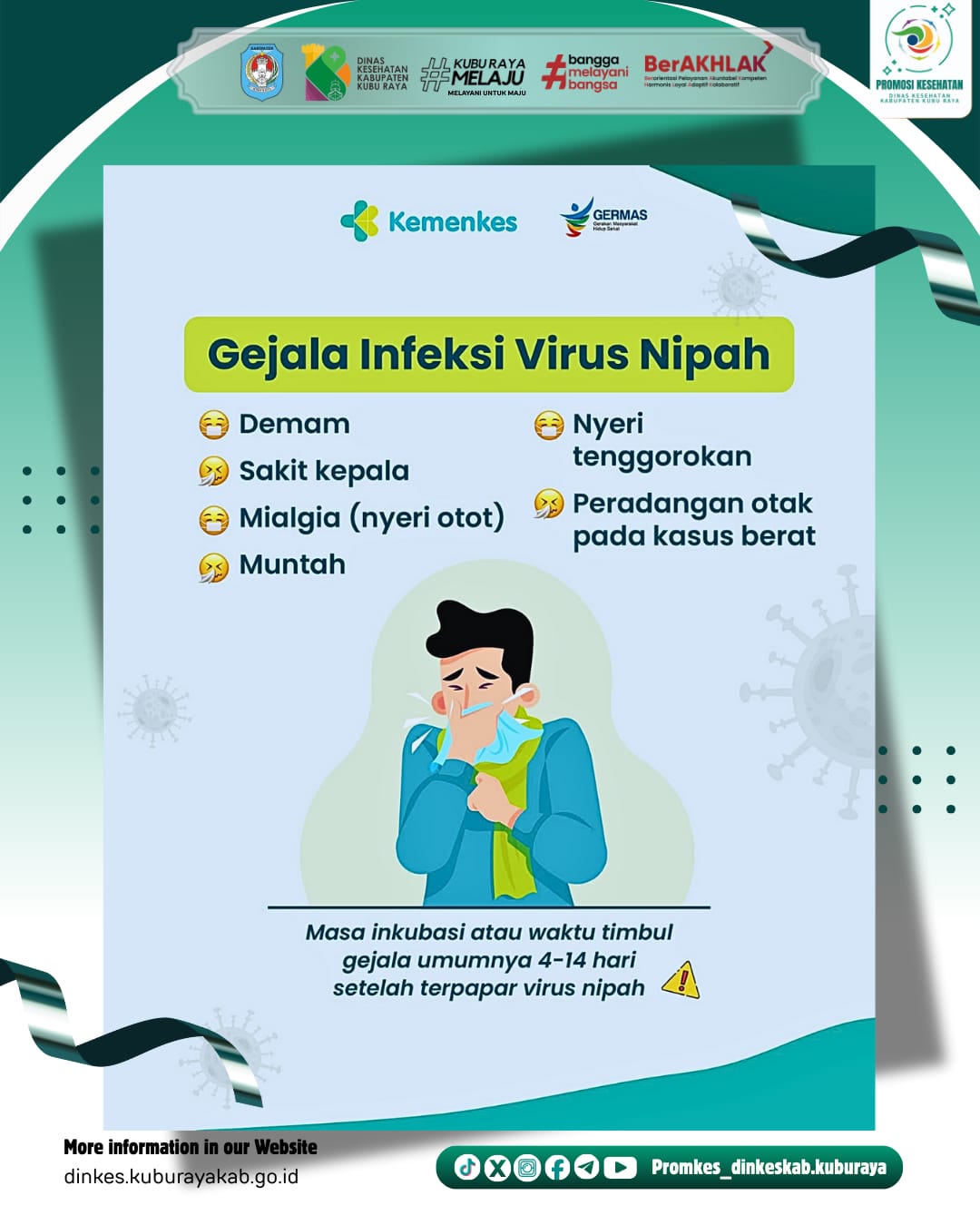 Sampai saat ini belum ditemukan kasus infeksi virus nipah di Indonesia. Namun, kita tetap harus waspada ya, karena sampai saat ini belum ada obat atau vaksin untuk pengobatan infeksi virus nipah☝️