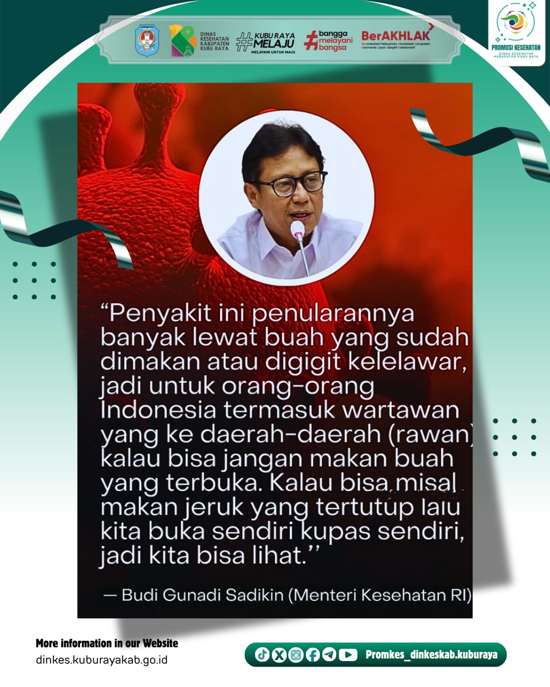 Menteri Kesehatan Republik Indonesia mengimbau seluruh masyarakat untuk meningkatkan kewaspadaan terhadap potensi penularan Virus Nipah. Salah satu langkah pencegahan penting adalah tidak mengonsumsi buah yang terbuka atau telah tergigit hewan, terutama kelelawar.