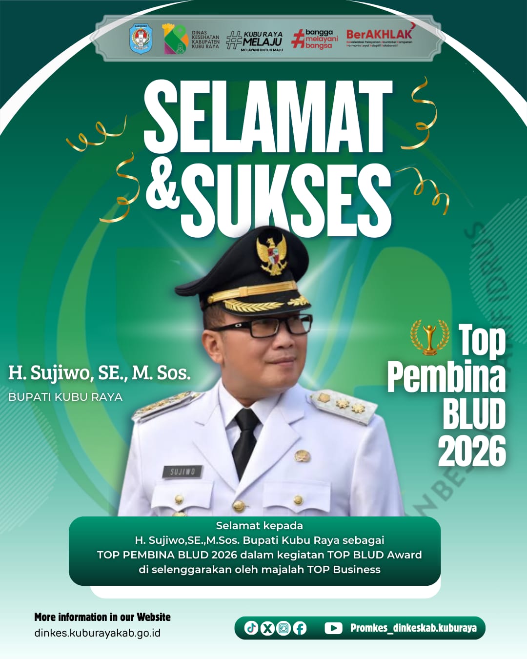 Keluarga besar Dinas Kesehatan Kabupaten Kubu Raya mengucapkan selamat dan apresiasi setinggi-tingginya kepada H. Sujiwo, SE., M.Sos., Bupati Kubu Raya, atas penghargaan sebagai TOP PEMBINA BLUD 2026 dalam ajang TOP BLUD Award yang diselenggarakan oleh Majalah TOP Business.